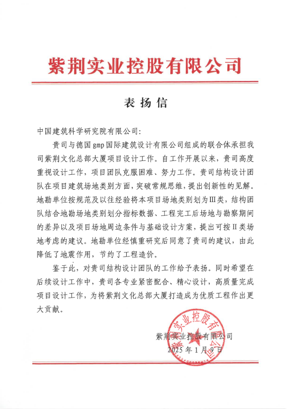 表扬信还寄望项目设计团队未来持续发力,将紫荆文化总部大厦打造成为优质工程。