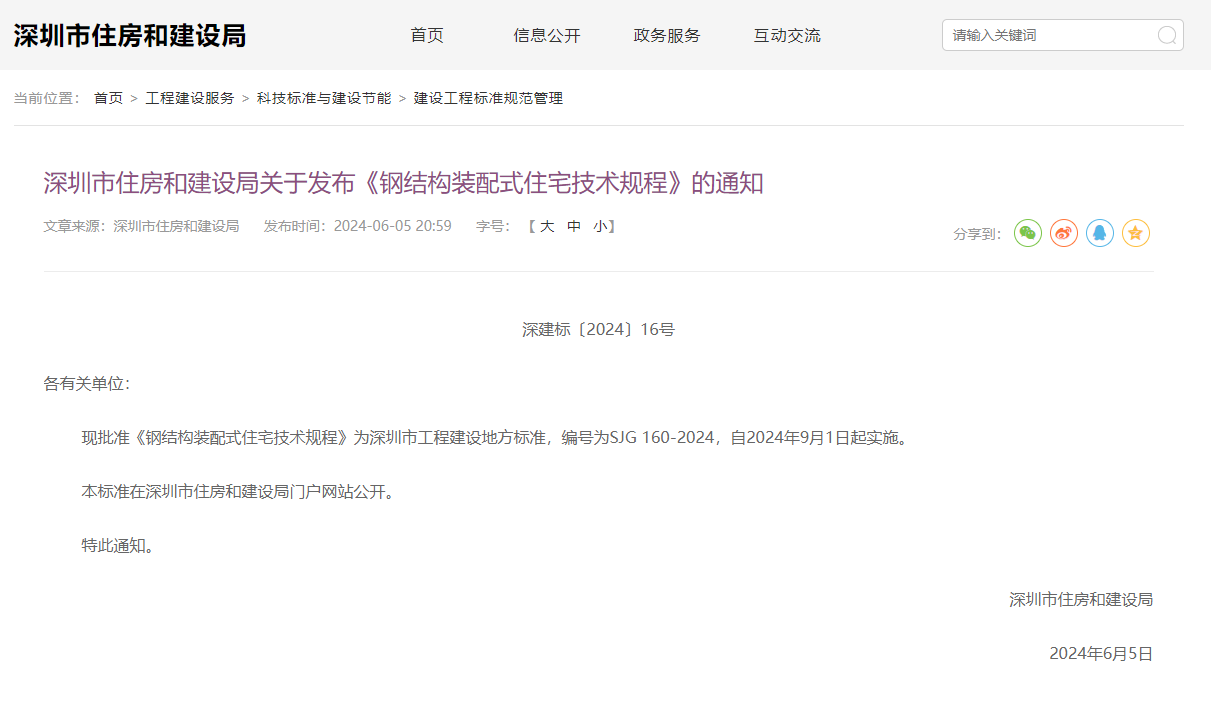 2024年6月5日,由利来w66[中国]最给利的老牌 深圳分公司参与主编的深圳市工程建设地方标准《钢结构装配式住宅技术规程》SJG160-2024正式发布,并将于2024年9月1日起正式实施。