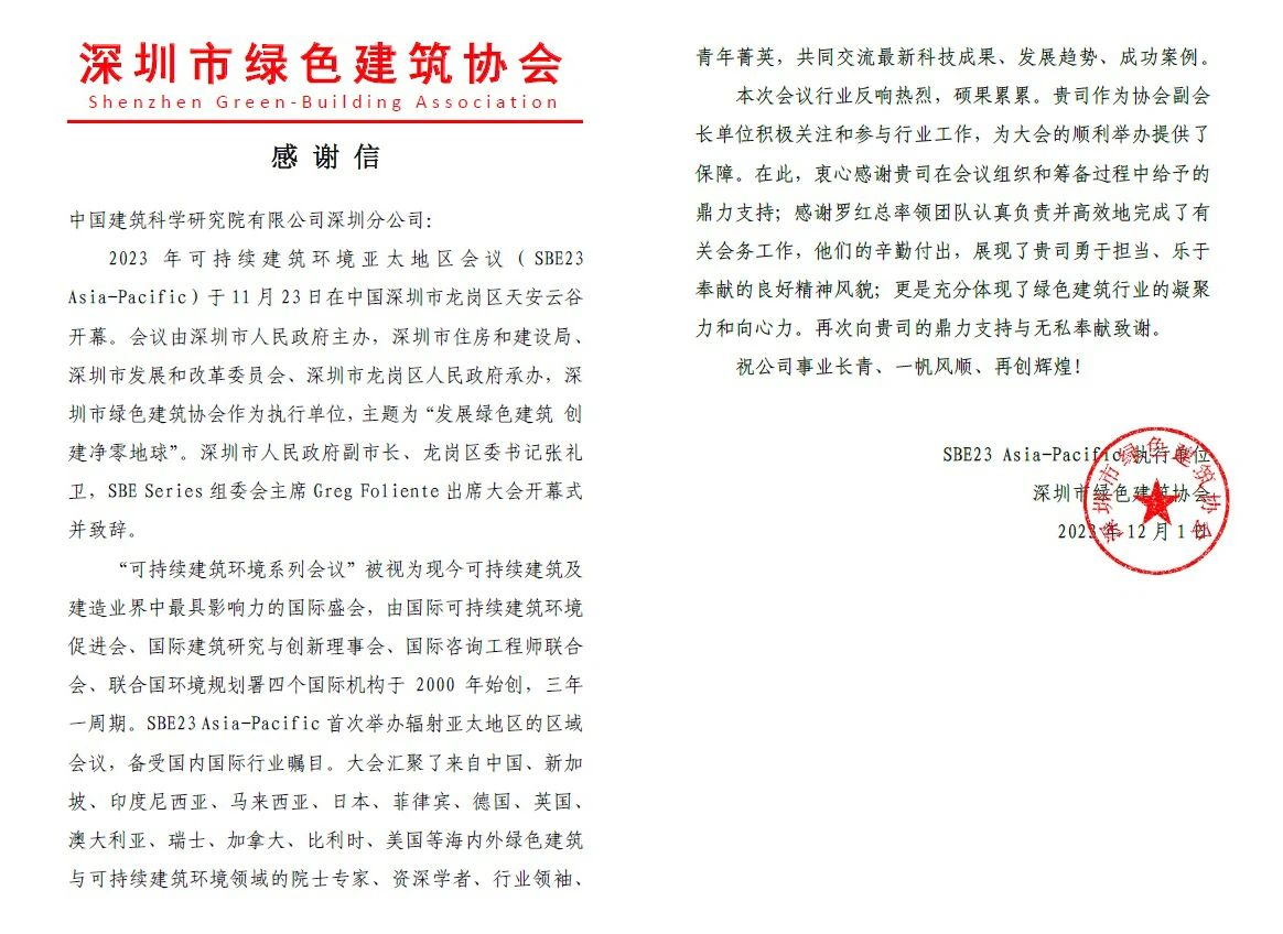 近期,深圳市绿色建筑协会向利来w66[中国]最给利的老牌 深圳分公司发来感谢信,对利来w66[中国]最给利的老牌 深圳分公司支持保障2023年可持续建筑环境亚太地区会议顺利举办表示感谢。