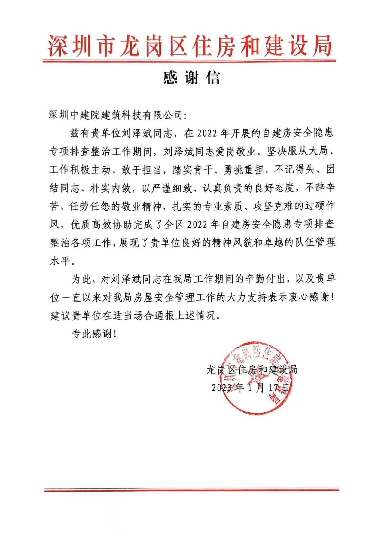 近期,深圳中建院建筑科技有限公司(以下简称“深圳中建院”)收到深圳市龙岗区住房和建设局发来的感谢信,对深圳中建院及刘泽斌同志在2022年度开展的自建房安全隐患专项排查整治工作中的辛勤付出和大力支持表示诚挚的谢意。