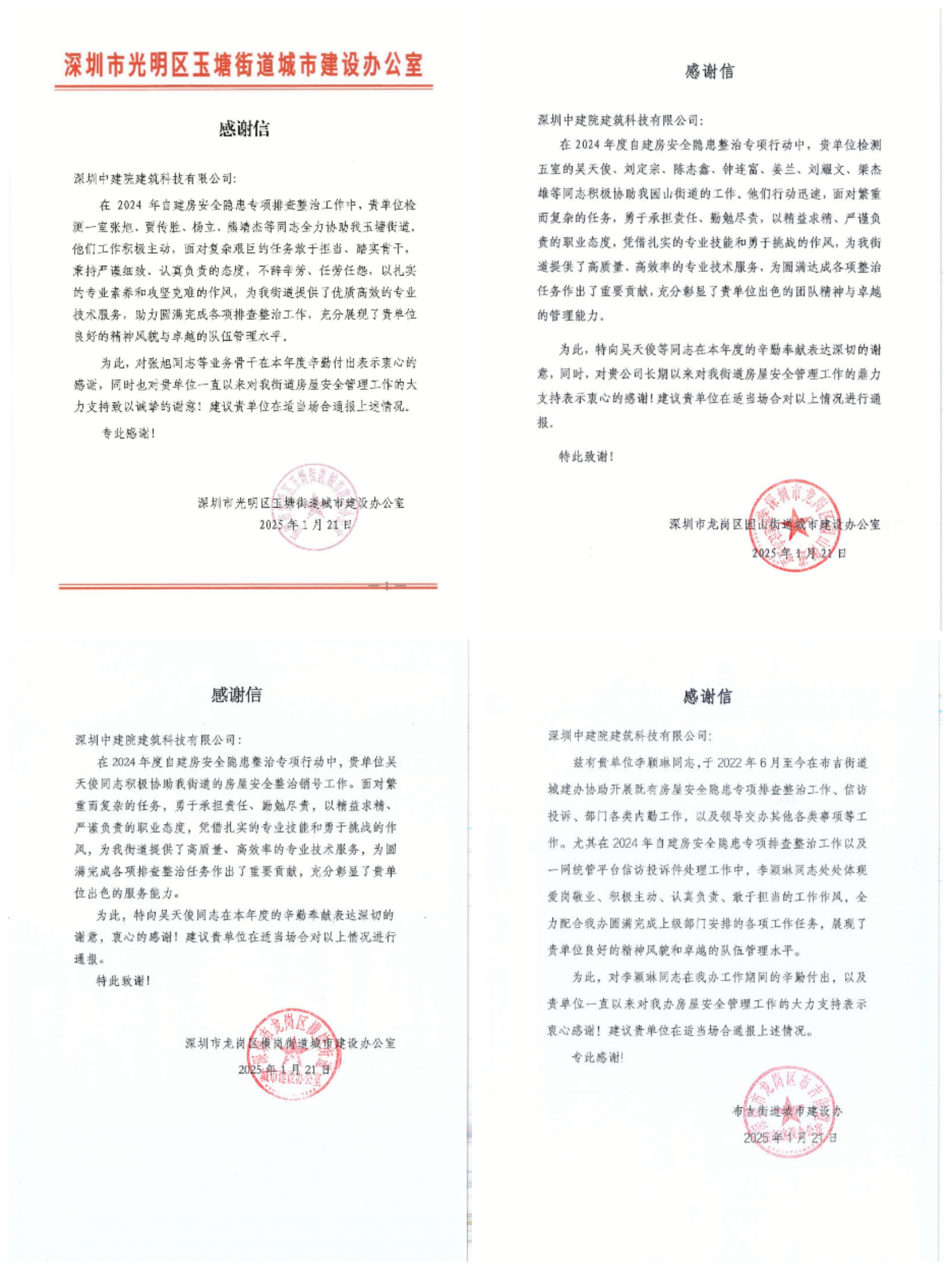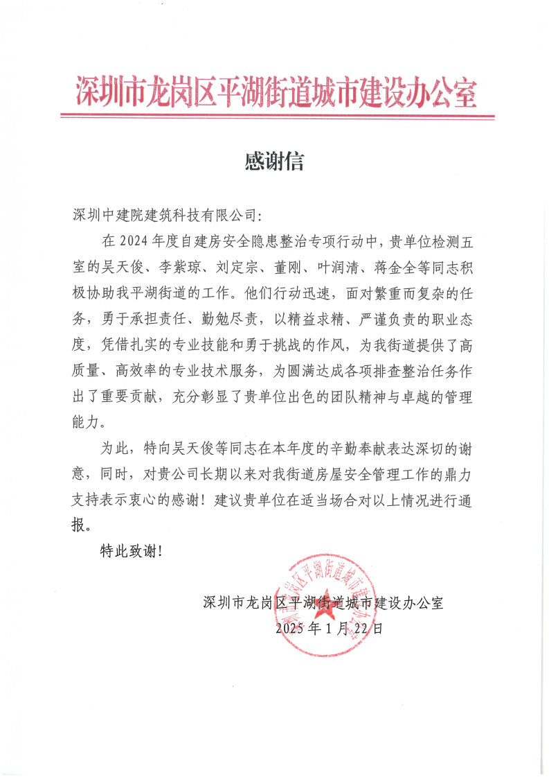 近日,利来w66[中国]最给利的老牌 深圳分公司所属深圳中建院陆续收到多封沉甸甸的感谢信——来自住房城乡建设部工程质量安全监管司、建筑市场监督司,深圳市光明区住房和建设局、龙岗区住房和建设局,及玉塘街道、园山街道、横岗街道、布吉街道、平湖街道、新桥街道等政府部门。信中向深圳中建院在2024年建筑市场监督执法房屋市政工程质量安全、住建行业灾害基础数据库建设监督检查工作中所作出的贡献,以及多年来对深圳市区住建部门、街道等辖区主管部门在房屋安全管理工作的默默付出表示感谢。