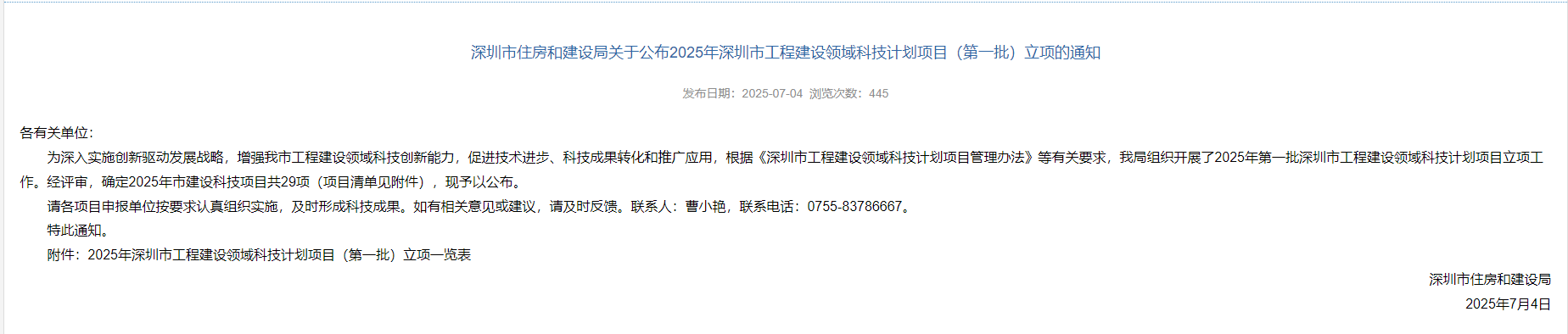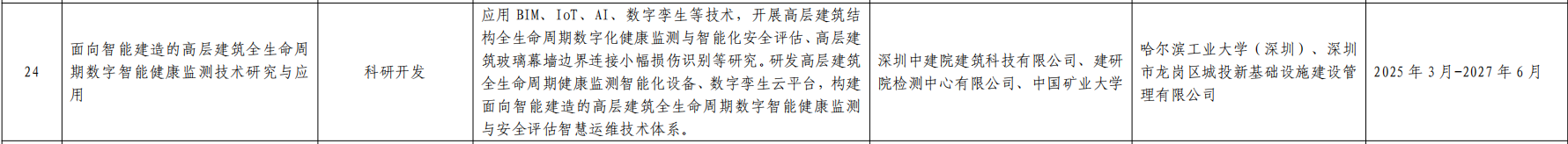 由公司牵头申报的科技项目《面向智能建造的高层建筑全生命周期数字智能健康监测技术研究与应用》,成功通过2025年深圳市工程建设领域科技计划项目(第一批)评审并获批立项。