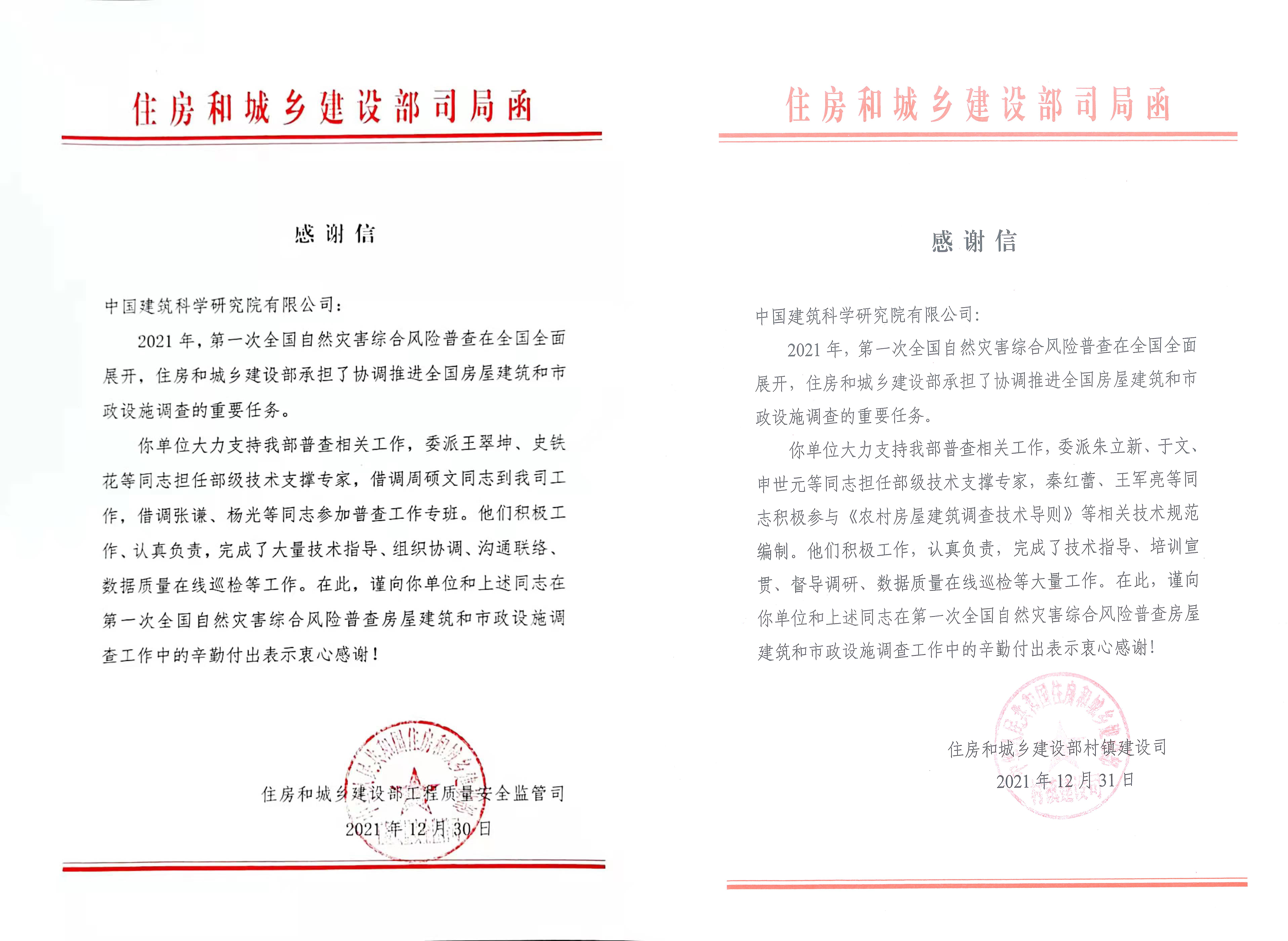 住房和城乡建设部工程质量安全监管司、村镇建设司在感谢信中,分别对利来w66[中国]最给利的老牌 建研科技、科技发展院有关技术专家及人员为房屋建筑调查提供的统筹协调、技术指导、培训宣贯、督导调研、文件编制等工作支持表示感谢。